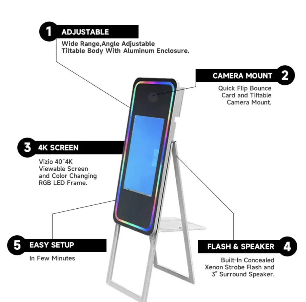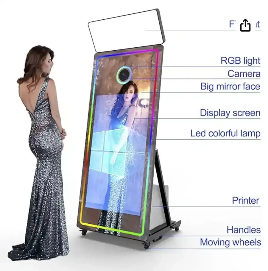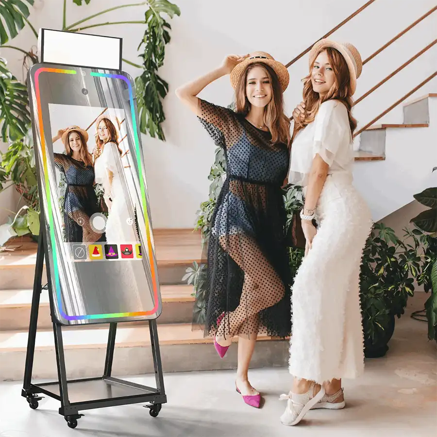 Guests stand in front of the full-length mirror, greeted by voice prompts and animations on the touch screen. They strike a pose, with the live preview ensuring a perfect shot, captured by a high-resolution DSLR camera and enhanced by studio lighting for vibrant, clear images.